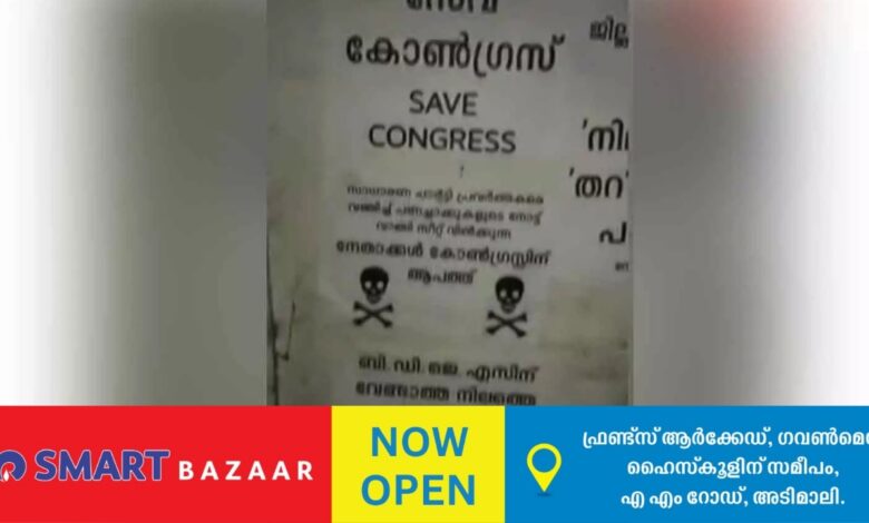 പണച്ചാക്കുകളുടെ നോട്ട് വാങ്ങി സീറ്റ് വിൽക്കുന്ന നേതാക്കൾ കോൺഗ്രസിന് ആപത്ത്’ ; കോൺഗ്രസ് നേതൃത്വത്തിനെതിരെ അടിമാലിയിൽ ‘സേവ് കോൺഗ്രസി’ന്റെ പേരിൽ പോസ്റ്റർ