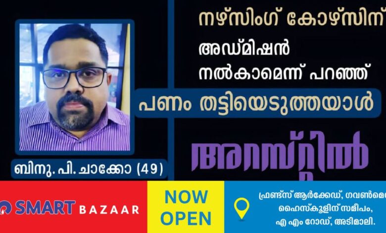 പാലക്കാട്, വടക്കഞ്ചേരി, ഞാറംവാൻകുളമ്പ്, കണക്കൻതുരുത്തി, പഴയചിറ വീട്, ബിനു. പി. ചാക്കോ (49) എന്നയാളെയാണ് കട്ടപ്പന ഡെപ്യൂട്ടി പോലീസ് സൂപ്രണ്ടിന്റെ നേതൃത്വത്തിലുള്ള പോലീസ് സംഘം അറസ്റ്റ് ചെയ്തത്. പാലാ, തിരുവല്ല എന്നീ സ്ഥലങ്ങളിലുള്ള നഴ്സിംഗ് കോളേജുകളിൽ അഡ്മിഷൻ തരപ്പെടുത്തി കൊടുക്കാമെന്നു പറഞ്ഞു കട്ടപ്പന സ്വദേശിയായ യുവതിയുടെ പക്കൽ നിന്ന് ലക്ഷക്കണക്കിന് രൂപ തട്ടിയെടുക്കുകയായിരുന്നു. സാമൂഹ്യ മാധ്യമങ്ങളിലെ പരസ്യം കണ്ട് യുവതി ഇയാളെ ബന്ധപ്പെടുകയും, തുടർന്ന് നഴ്സിംഗ് അഡ്മിഷൻ നൽകാമെന്ന് പറഞ്ഞു രണ്ട് ലക്ഷത്തി നാൽപതിനായിരം രൂപ കബളിപ്പിച്ചെടുക്കുകയുമായിരുന്നു.