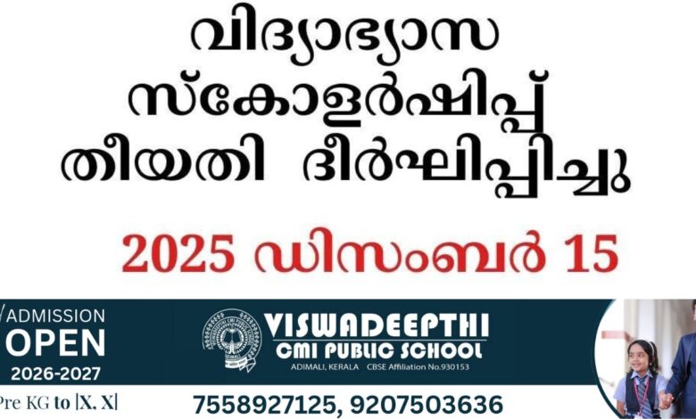 കേരള മോട്ടോര് തൊഴിലാളി ക്ഷേമനിധി പദ്ധതിയില് അംഗങ്ങളായ തൊഴിലാളികളുടെ മക്കള്ക്ക് 2025 – 2026 അധ്യയന വര്ഷത്തേക്കുള്ള വിദ്യാഭ്യാസ സ്കോളര്ഷിപ്പിന് അപേക്ഷ സ്വീകരിക്കുന്ന തീയതി 2025 നവംബര് 30 തീയതിയില് നിന്നും 2025 ഡിസംബര് 15 തീയതി വരെ ദീര്ഘിപ്പിച്ചു. ജില്ലാ ഓഫീസില് നിന്ന് നേരിട്ടും ബോര്ഡിന്റെ ഔദ്യോഗിക വെബൈറ്റില് നിന്നും http://kmtwwfb.org അപേക്ഷ ഡൗണ്ലോഡ് ചെയ്തെടുക്കാം. അപേക്ഷയോടൊപ്പം ഫോണ് നമ്പര് കൂടി രേഖപ്പെടുത്തണം. കൂടുതല് വിവരങ്ങള്ക്ക് തൊടുപുഴയിലുള്ള ജില്ലാ ഓഫീസുമായി ബന്ധപ്പെടുക. ഫോണ് നമ്പര്:04862220308