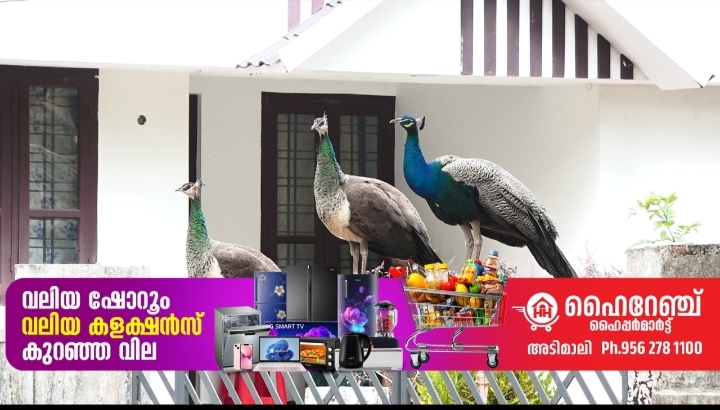 അടിമാലി: അഴകില്‍ പറന്നിറങ്ങുന്ന മയിലുകളെ കാണാന്‍ അടിമാലിക്കാര്‍ക്ക് ഇപ്പോള്‍ അധിക ദൂരം സഞ്ചരിക്കണ്ട. ദിവസങ്ങളായി അടിമാലി ടൗണിന്റെ  പരിസര പ്രദേശങ്ങളായ കരിങ്കുളം, ഫയര്‍‌സ്റ്റേഷന്‍പടി ഭാഗങ്ങളിലൊക്കെ  കൂട്ടത്തോടെയാണ് മയിലുകള്‍ എത്തുന്നത്. മഴക്ക് മുമ്പ് പീലി വിടര്‍ത്തിയാടുന്ന മയിലുകള്‍ നയന മനോഹര കാഴ്ച്ചയാണ് ഒരുക്കാറുള്ളത്. എന്നാല്‍ ഇപ്പോള്‍ കാടിറങ്ങിയെത്തുന്ന മയിലുകള്‍ പാടത്തും പറമ്പിലും എന്നു വേണ്ട കോണ്‍ക്രീറ്റ് വീടുകളുടെ ടെറസുകളില്‍ വരെ ചിറകു വിരിച്ച് നൃത്തം വയ്ക്കുന്ന കാഴ്ച സാധാരണയായി കഴിഞ്ഞു.