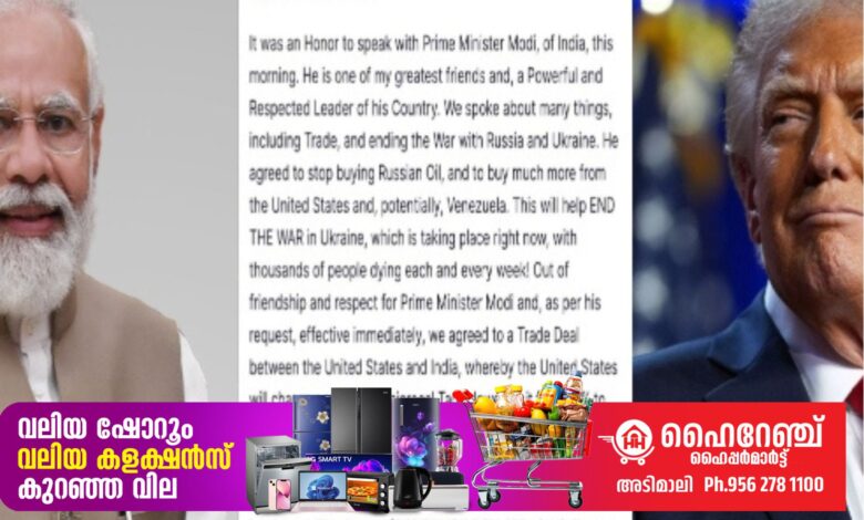 ഉടനടി പ്രാബല്യത്തിൽ വരുന്ന തരത്തിൽ യുഎസ് ഇന്ത്യൻ തമ്മിലുള്ള ഒരു വ്യാപാര കരാറിന് തങ്ങൾ സമ്മതിച്ചു. ഇതിലൂടെ കുറഞ്ഞ താരിഫ് ഈടാക്കും. 25 % നിന്ന് 18% ആയി താരിഫ് കുറയ്ക്കും പ്രധാനമന്ത്രി നരേന്ദ്രമോദിയുടെ അഭ്യർത്ഥന മൂലമാണ് കരാറിലേക്ക് എത്തിയതെന്നും ട്രംപ് വ്യക്തമാക്കി.500 ബില്യൺ ഡോളറിൽ അധികം വരുന്ന യുഎസിന്റെ ഊർജ്ജം, സാങ്കേതികവിദ്യ കൽക്കരി തുടങ്ങിയ അമേരിക്കൻ ഉൽപ്പന്നങ്ങൾ വാങ്ങുമെന്ന് ഉറപ്പും പ്രധാനമന്ത്രി നരേന്ദ്രമോദി നൽകി. ഇത് ഇന്ത്യയുമായുള്ള ബന്ധം ഭാവിയിൽ കൂടുതൽ ശക്തമാകും. താനും പ്രധാനമന്ത്രി മോദിയും പറയുന്ന കാര്യങ്ങൾ ചെയ്യുന്ന രണ്ടുപേരാണെന്നും ഡോണാൾഡ് ട്രംപ്